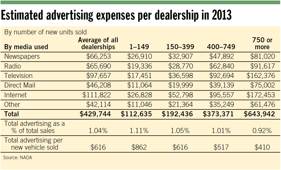 Traditionally the expense for advertising as a percentage of gross profit is substantially higher than the expense for training. According to the NADA 2014 Data Financial Profile, the average dealership spends about $616 per vehicle sold to advertise (see chart).
